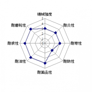 耐磨性、耐水性、耐酸鹼、耐油性、耐老化、耐候性、耐臭氧、高彈性、在高硬度時也有充分的彈性及伸長性。